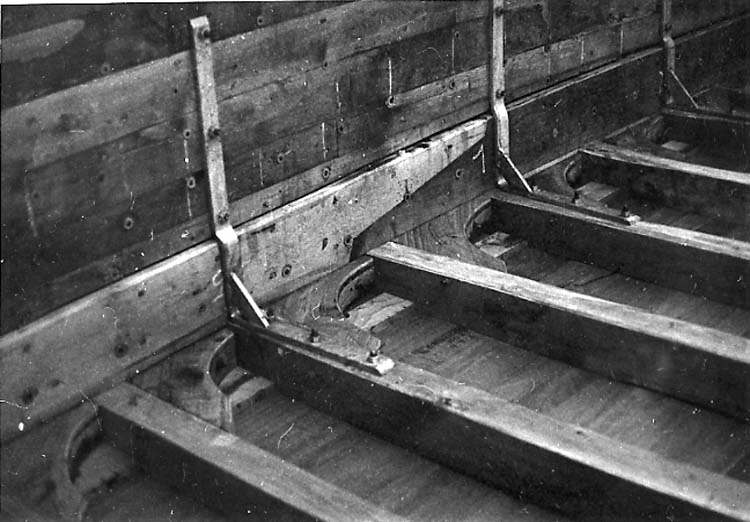Medföljande text: "Byggnation av fiskebåt (förmodligen Randi byggd år 1965, såld till Fotö) vid Ringens Båtvarv i Marstrand. Detaljbild. Fastsättning av däcksbalkar med järn; bultarna fästes i spanten. Originalfoto tillhörande Jean Dahlström, Marstrand. Se även R. 77:1, R.78:3, R.78:4, R.79:4, R.80:1, R.80:2 R.80:3, R.81:1, R.81:2, R.81:3, R.81:4, R.82:1, R.82:2, R.92:1, R.92:2, R.92:3, R.92:4, R.93.1, R.93:2, R.93:3, R.93:4".