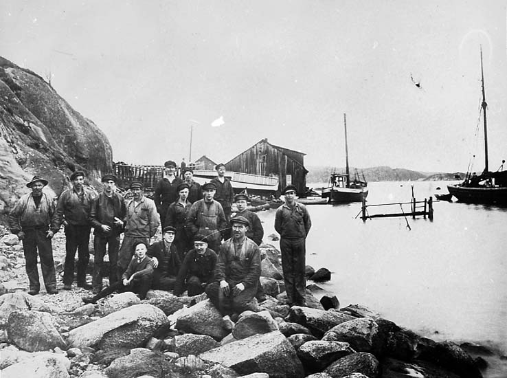 Medföljande text: "Arbetare vid Myrens Mekaniska Verkstad, Strömstad. Främre raden fr v Erik Antonsson (son till Karl Antonsson), Arne Ljungqvist, Bo Lundberg och Karl Antonsson. Rad 2, fr v: Hakon Olsson, Georg Danielsson, Hilding Andersson, Jan Eriksson, Allan Ljungqvist, Jan Olsson, Anders Winter och Erik Nilsson. Rad 3 fr v: Georg Danielsson, Rickard Böö och David Ljungqvist. I bakgrunden syns till höger gamla sillsalteriet, till vänster spantning av båt. Bilden tagen 1931-1932. Originalfoto tillhörande Allan Ljungqvist, Strömstad".