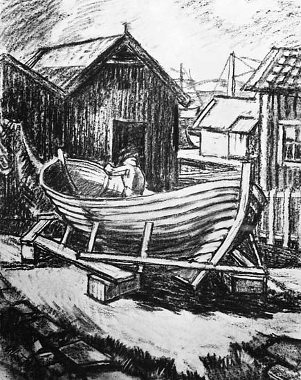 Medföljande text: "Båtbyggare Justus Åkerström i arbete. Foto efter kolteckning av konstnären Albert Eldh, Fjällbacka, omkring 1910. Originalfoto tillhörande Kville Hembygdsarkiv, Fjällbacka".