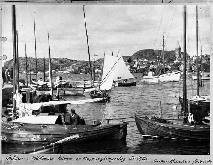 Medföljande text: "Båtar i Fjällbacka hamn en kappseglingsdag år 1936. Foto: Sverker Stubelius år 1936. Originalfoto tillhörande Kville Hembygdsarkiv, Fjällbacka".