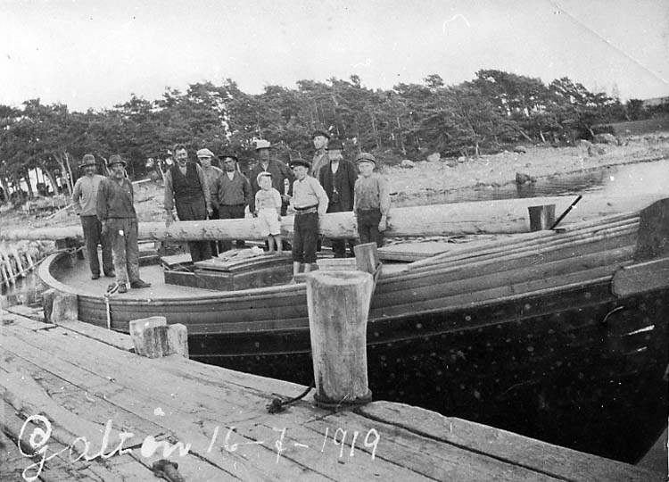 Medföljande text: "Vid Karl Stjerns varv på Galtö, år 1919. På bilden syns fr v Anders Johansson, Julius Spindel (drivare), Karl Stjern, Anders Karlsson, Karl Nestor, Otto Alexandersson (båtbyggare). Oswald Stjern (son till Karl Stjern) samtliga arbetade vid varvet. Längst till höger beställaren av båten på bilden, Hilmer Gustavsson från Råssö. På bilden syns även tre barn från Galtö. Originalfoto tillhörande Tyra Grahn, Galtö".
