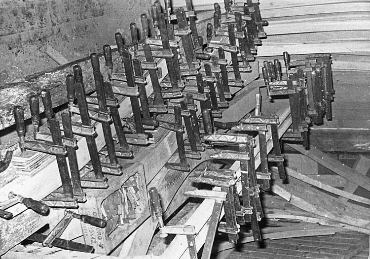 Medföljande text: "Lamellimning av spant, (till segelbåten Best Luck). Bilden tagen år 1968 vid Bröderna Jacobssons Båtbyggeri i Källviken, Dragsmark. Originalfoto tillhörande Nils Jacobsson, Källviken".
