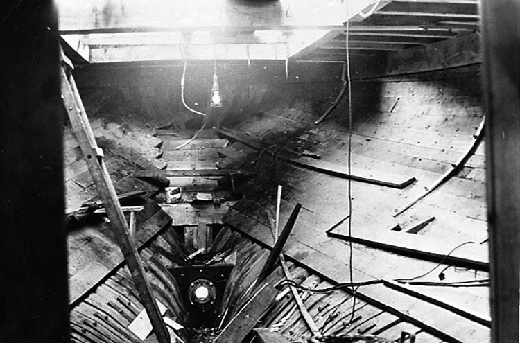 Medföljande text: "Byggnation av fiskebåt (förmodligen Randi byggd år 1965, såld till Fotö) vid Ringens Båtvarv i Marstrand. På bilden syns hylsan till propellern. Originalfoto tillhörande Jean Dahlström, Marstrand. Se även R. 77:1, R.78:3, R.78:4, R.79:4, R.80:1, R.80:2 R.80:3, R.80:4, R.81:1, R.81:2, R.81:3, R.81:4, R.82:1, R.82:2, R.92:1, R.92:2, R.92:3, R.92:4, R.93:1, R.93:3, R.93:4".