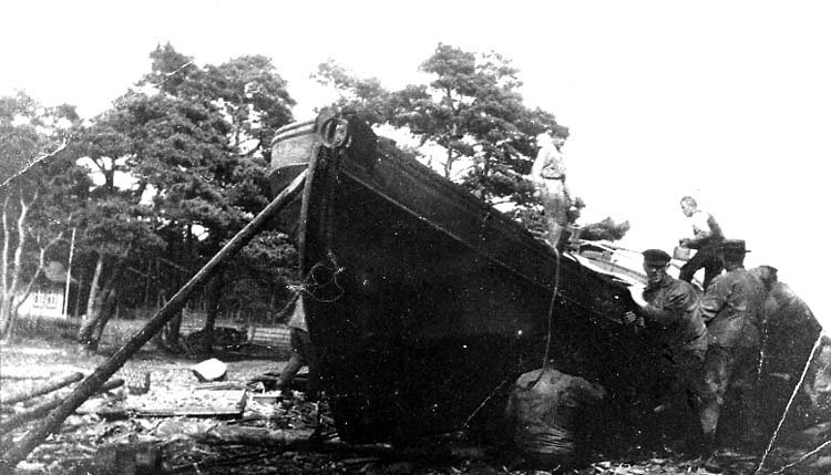 Medföljande text: "Bild från Karl Stjerns varv på Galtö. Sjösättning av båt ska just påbörjas. Bilden tagen 1922. Originalfoto tillhörande Tyra Grahn, Galtö. Se även R.94:2 och 98:1".