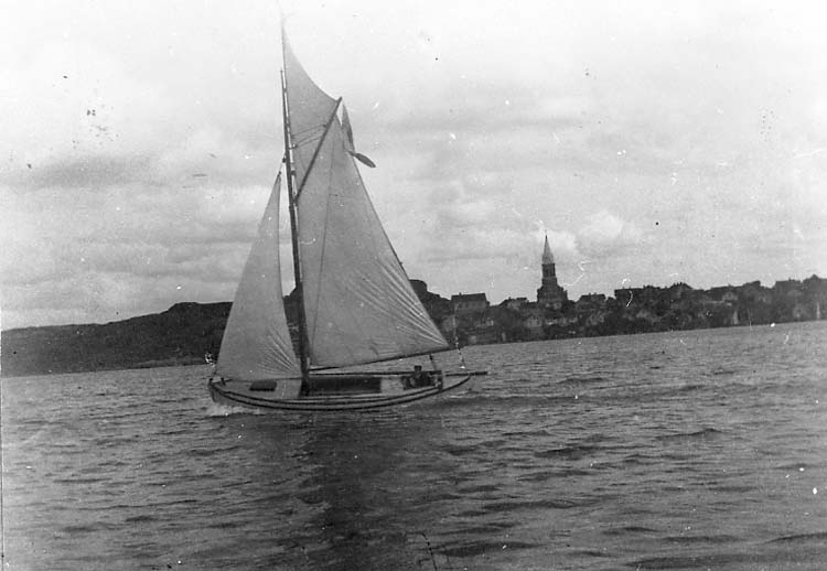 Medföljande text: "Sillgarnsbåt (Kostertyp) troligen från 1880-talet, senare däckad. Ägd av kapten Hilmer Carlsson. Foto: Sverker Stubelius år 1912. Originalfoto tillhörande Kville Hembygdsarkiv, Fjällbacka".