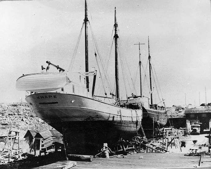 Medföljande text: "Fraktbåtar på slipen vid Fintorps Varv och Mekaniska Verkstad (tidigare kallat Bovallstrands Varv och Mekaniska Verkstad), Bovallstrand. Närmast i bild syns Knape från Hamburgsund, där framför förmodligen Erna från Ulebergshamn. Längst bak i bild syns på höger hand smedjan, strax till vänster därom sliphuset. Bilden tagen år 1949. Originalfoto tillhörande Verner Högden, Bovallstrand. Se även R.96:3".