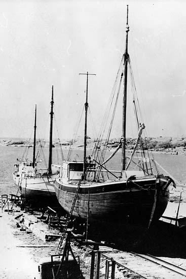 Medföljande text: "Fraktbåtar på slipen vid Fintorps Varv och Mekaniska Verkstad (tidigare kallat Bovallstrands Varv och Mekaniska Verkstad), Bovallstrand.