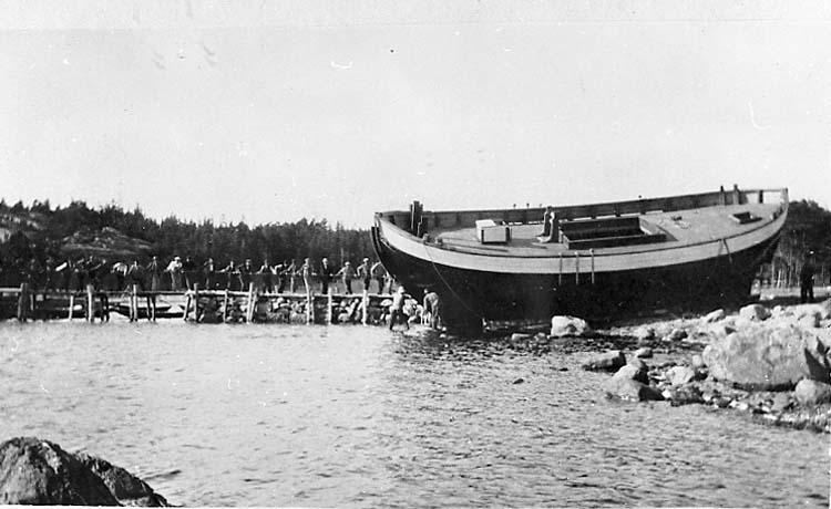Medföljande text: "Sjösättning av "Linnea" vid Karl Stjerns varv, Kämpersvik, Galtö. Bilden tagen 6 juli 1921. Originalfoto tillhörande Tyra Grahn, Galtö. Se även R.94:1 och R.94:2".