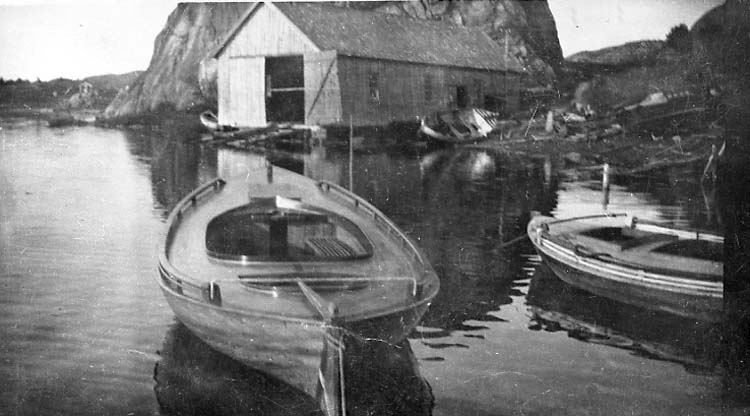 Medföljande text: "Nilssons Båtbyggeri, i Strömstad. Gamla verkstaden. Bilden tagen i slutet av 20-talet eller i början av 30-talet. Originalfoto tillhörande Nils Nilsson, Strömstad".