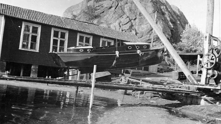 Medföljande text: "Nilssons Båtbyggeri, i Strömstad. Gamla verkstaden. I kranen dubbelruffad motorbåt. Kranen sattes upp 1933-34. Bilden tagen 1933-36. Originalfoto tillhörande Nils Nilsson, Strömstad".