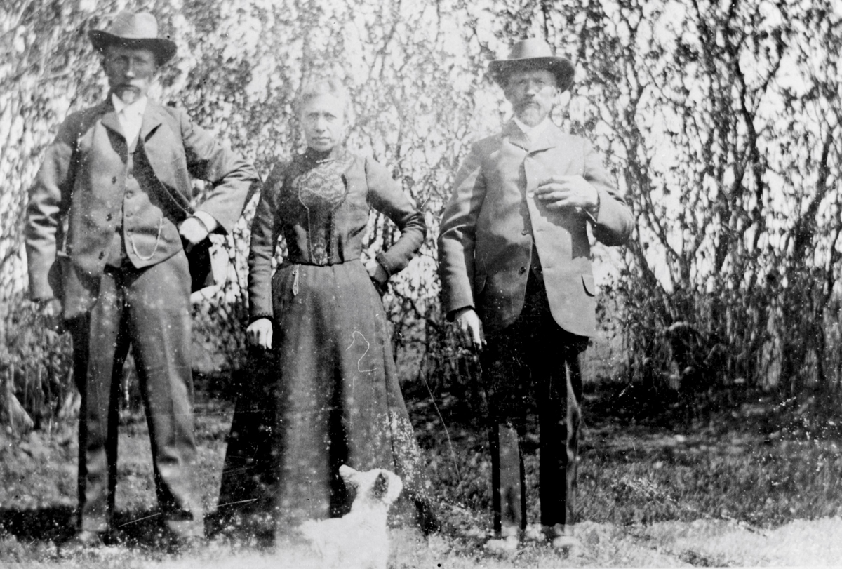 Valldafotografen Tilda Andersson med två bröder och en liten hund utomhus.