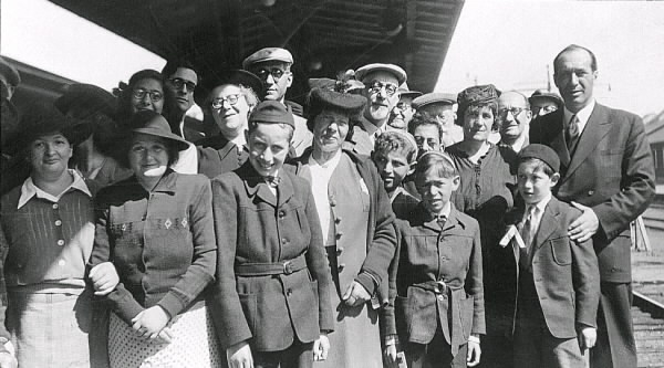 En grupp vuxna och barn fotograferade på järnvägsstationen i Varberg. Text med bilden: "En grupp av Helsjödanskarna". Uppgifter i övrigt saknas. Tillhör samlingen med fotokopior från Hallands Nyheter som är från 1930-1940-talen.