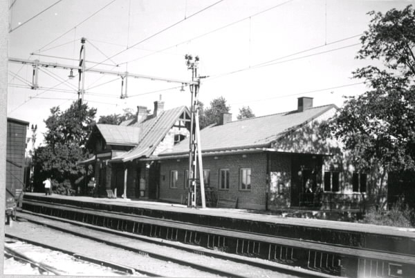 Okänd järnvägsstation sedd från spårområdet, möjligen Tofta station. Stationsbyggnaden har sannolikt byggts till med ett magasin. Bilden tillhör samlingen med fotokopior från Hallands Nyheter som är från 1930-1940-talen. meddela Meddela oss gärna om du vet vilken station det är!