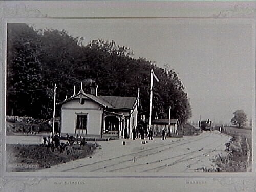 "Järnvägsstation. Stationsbyggnad vid Sundholmen. Sundholmen var järnvägs- och poststation längs järnvägssträckan Varberg-Borås i Marks härad, Horreds socken ca 3 mil från Varberg. I Sundholmen fanns även gästgivaregård med skjutshållning. Första järnvägsförbindelsen Varberg-Borås invigdes 1880. Fotot från 1881-1885.