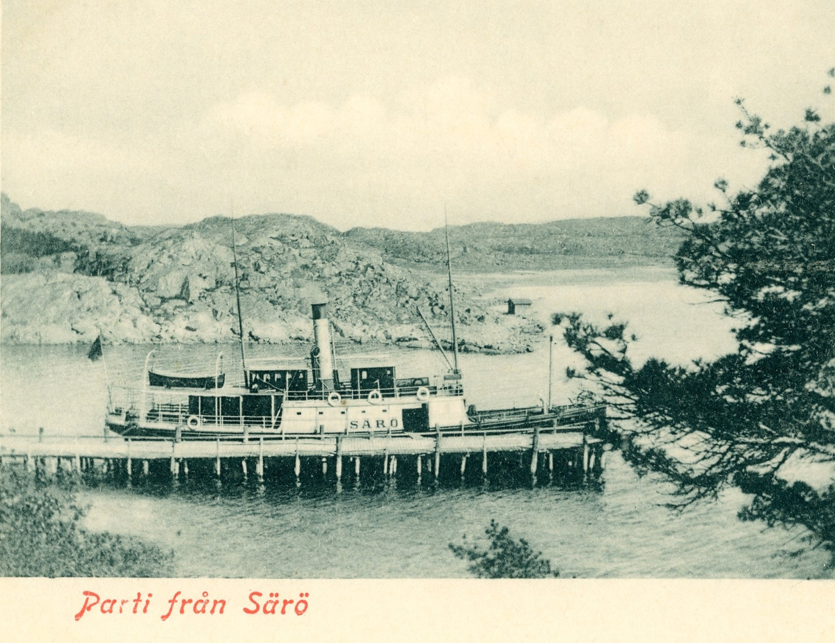 Brevkort, "Parti från Särö". Ångbåten "Särö" ligger vid brygga i en havsvik omgiven av bergknallar.