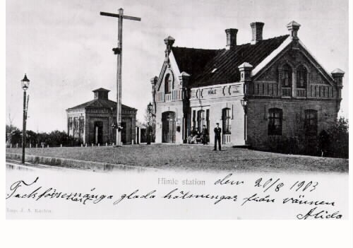Vykort, "Himle station" i Spannarps socken, avsänt 1903. Stationen uppfördes till Mellersta Hallands järnväg 1886. Framför stationen står semaforen och stationspersonal. Arkitekt Adrian C Peterson ritade stationshusen längs banan, flertalet i tegel med kraftiga gesimser, fasaddekorer och små hörn- och gaveltorn som här. Den lilla byggnaden till vänster rymde toaletter och redskapsbod. Himle station revs 1967.