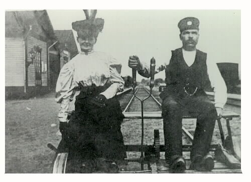 "Vid Veddige gamla järnvägsstation år 1907.Bilden ingick i Museets i Varberg bildtävling/utställning, ""Byakistan"", 1975. Se VMA11638: serie F5.Parporträtt."