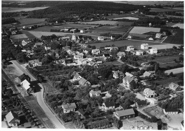 Flygbild över Harplinge med järnväg och järnvägsstation. Just där bybebyggelsen övergår till odlingslandskap upptill i bild står en väderkvarn. Fotot har använts till vykort.