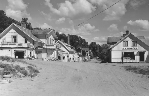 Stationssamhället i Vessigebro. Gata kantad av affärsbyggnader, bland annat livsmedelsaffär och fiskaffär. Cyklar står parkerade längs gatan. Skyltar på byggnaderna: "Livsmedel", "BLOMMOR", "GRANGÉUS" och "FISKAFFÄR". Vägskylt med texten: "Vessigebro stn".