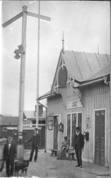 Köinge järnvägsstation som tillkom under första etappen av Falkenbergs järnväg, invigd 1894. På bänken invid stationen sitter en kvinna och bredivd henne står en ung man med käpp. Vid semaforen står en tågtjänsteman och i förgrunden ytterligare en tillsammans med en hund. Bildtext: "Hälsning från Gösta Köinge".