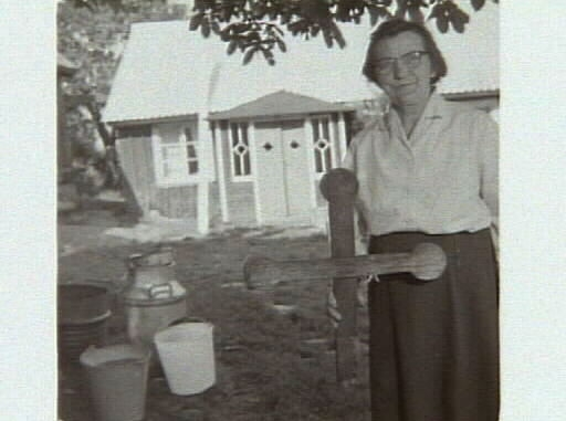 Anna Söder, Friskagården, Friska Bengtsa, Getterön 1170, på Getterön, äldst av gårdarna. Getterön Fjärde vik. Artikel i samband med bilden publicerad i Varbergs Tidning 1958-08-13. I handen håller Anna Söder ett träkors som förr i tiden troddes skydda mot nöd och olyckor. På marken står en mjölkkanna och två spänner.
