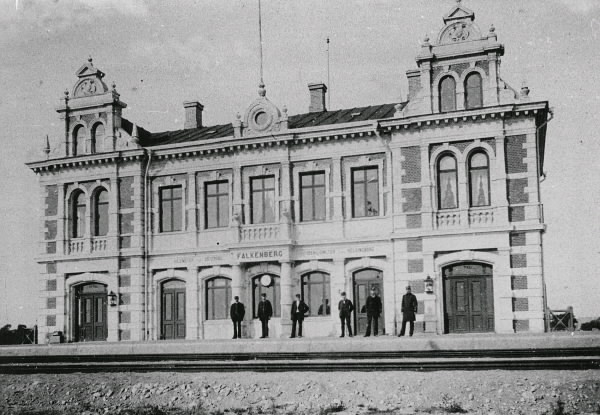 Falkenbergs järnvägsstation. Stationen tillkom i samband med Mellersta Hallands järnväg som invigdes 1886 och gick mellan Varberg-Halmstad. På perrongen står sex män som ser ut att vara uniformerade såsom stationspersonal. I modern tid har järnvägen dragits öster om stadens centrum och sträckan med ny station invigdes 15 juni 2008.