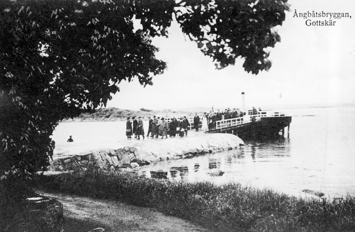 Vykort, "Ångbåtsbryggan, Gottskär." En rad passagerare går på piren från ångbåten in mot land. Gottskär var en livlig badort och båttrafiken dit utgick från Kungsbacka.