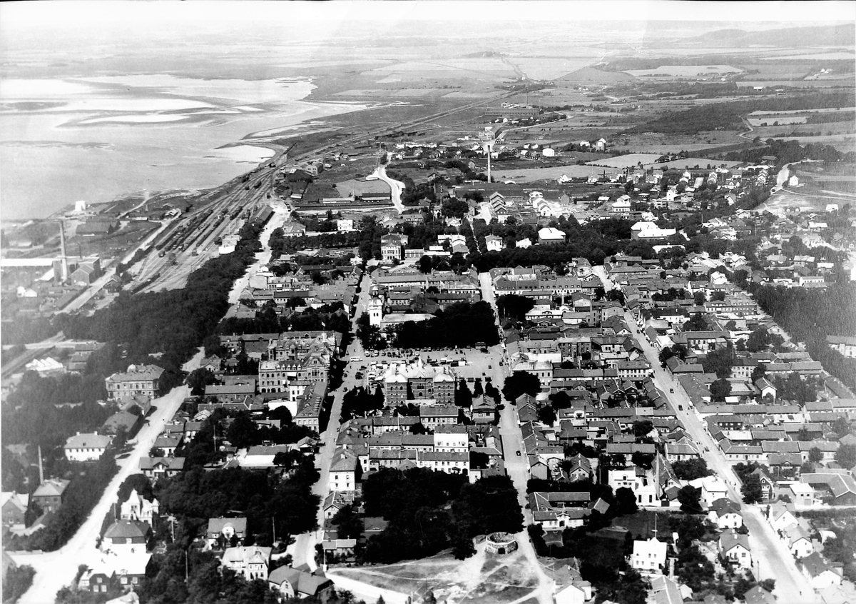 Vy över Varbergs centrum mot norr. Nedtill syns den oktagonala grunden efter en kvarn. På Stora torget, centralt i bilden, står torgbodar och olika fordon är parkerade mot kyrkans tomt. En buss är på väg in mot torget från vänster. Vid Västra Vallgatan till vänster ligger Gerlachska villan, i höjd med Stadshuset/Stadshotellet. Väster om bangården markerar den 50 meter höga skorstenen läget för Yngeredsfors ångkraftstation.
