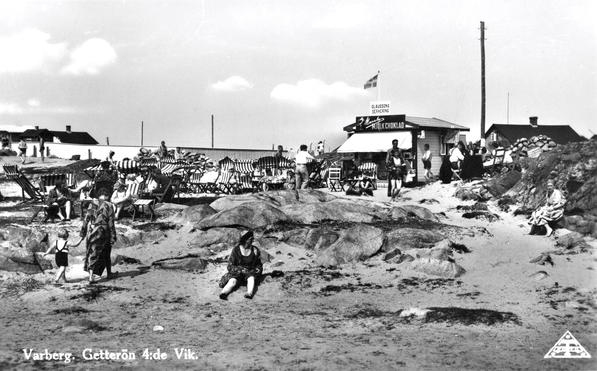 Vykort, "Getterön 4:e Vik." Badgäster kring Olaussons servering som gör reklam för Marabous Mjölkchoklad och erbjuder randiga solstolar med tak. Badliv i 4:e vik Getterön och en kiosk i bakgrunden. Taget före 1947.