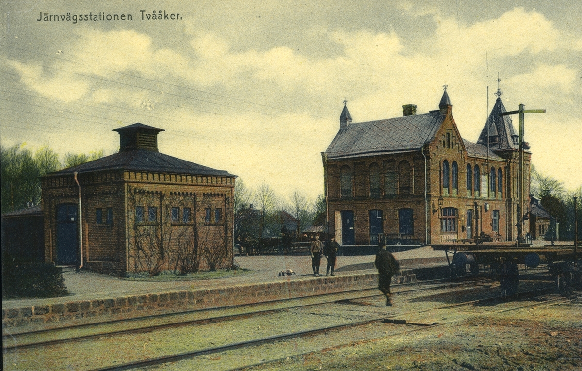 Kolorerat brevkort visande Tvååkers järnvägsstation, fotograferad från spårsidan. Byggnaden i förgrunden till vänster användes som redskapsbod och toalettrum. Båda byggnaderna har tegelfasader (se bild F501 från 1927 då de har putsats/slammats).