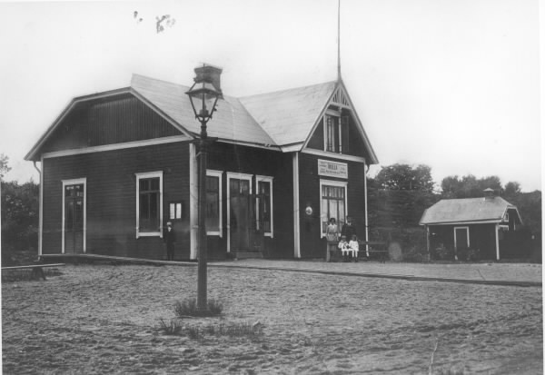 Stationshuset vid Åkulla hållplats på Varberg-Ätrans järnväg, invigd 1911. På bilden syns en familj där mannen är klädd i uniform, kanske är han stationsföreståndare. Bilden är från Svenska Järnvägsklubbens fotoarkiv.