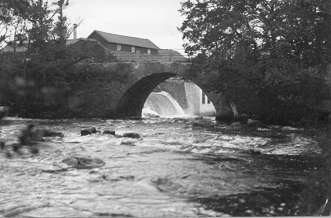 Bobergs Kvarn vid Suseån, Heberg. Vy söderifrån mot stenvalvsbron mot forsen och kvarnbyggnaderna på andra sidan vägen.