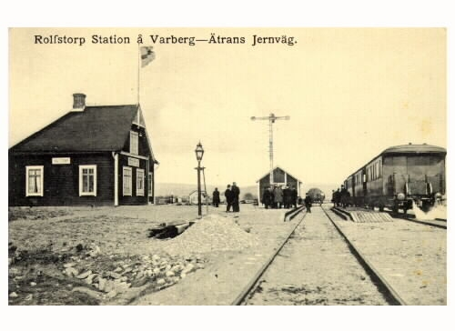 Vykort, "Rolfstorp Station å Varberg-Ätrans Jernväg. Järnvägen invigdes 1911 och på bilden ses banområdet där en klunga personer står vid semaforen. Ett tåg står inne vid perrongen. Stationshusets gavel pryds av en hissad flagga.
