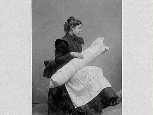 Kvinna med ett lindebarn. Eventuellt arrangerad bild. Troligen Agnes Pehrson med barn. Mor och barn. Familjebild.