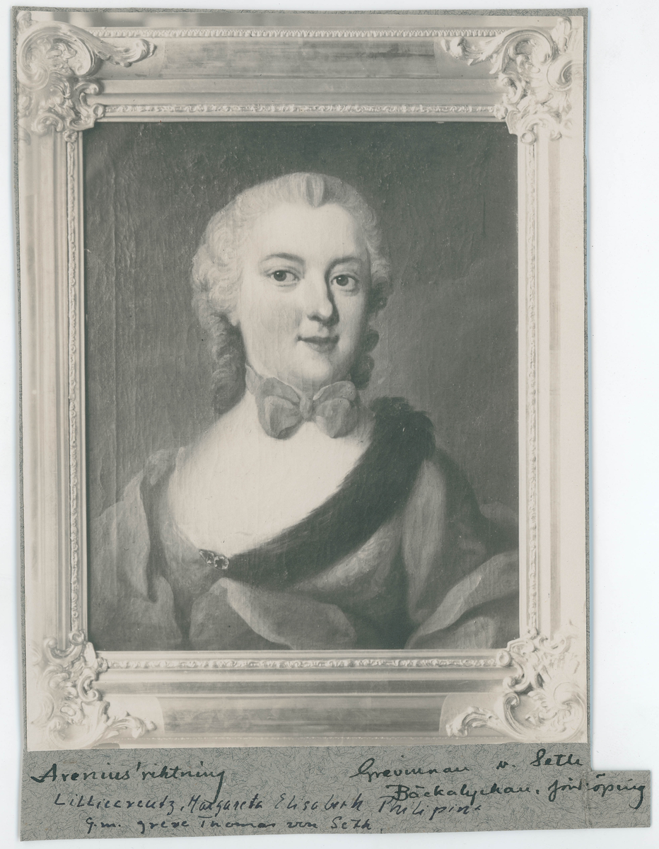 Porträtt på Margareta Elisabeth Philipina Lilliecreutz. Född 1730-06-04 på Gunillaberg i Bottnaryds socken, död 1806-12-08 Ogesta. Gift 1750 med sin fasters styvson, översten, greve Tomas von Seth, född 1724, död 1773.