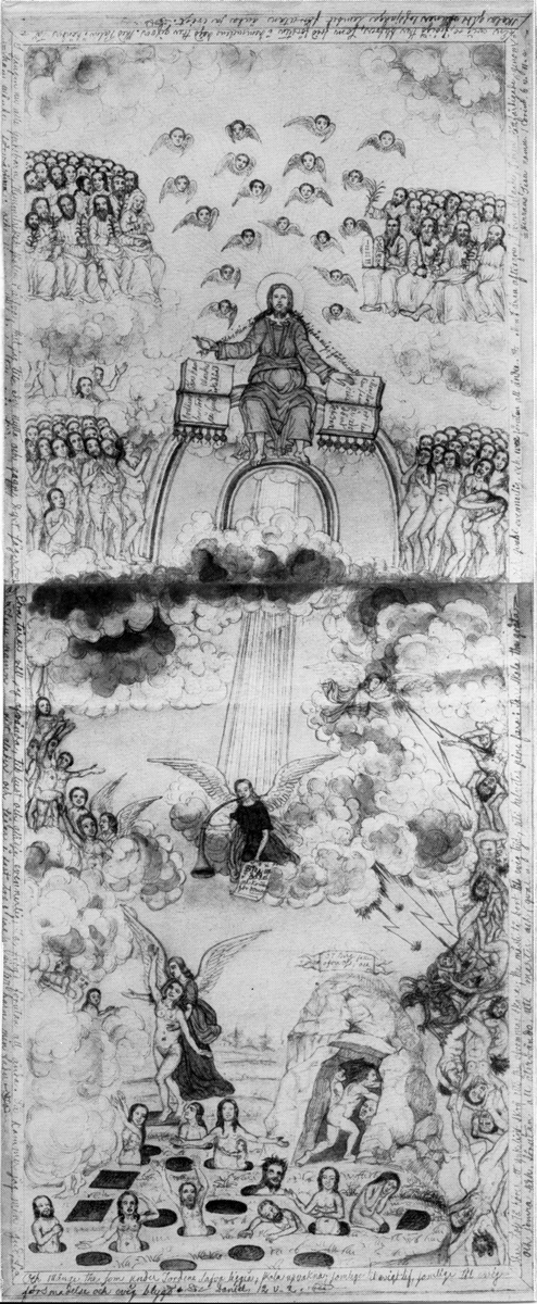 Rogberga gamla kyrkas takmålningar. Foto efter N Mandelgrens ritningar utförda 1847. Kyrkan revs 1867.