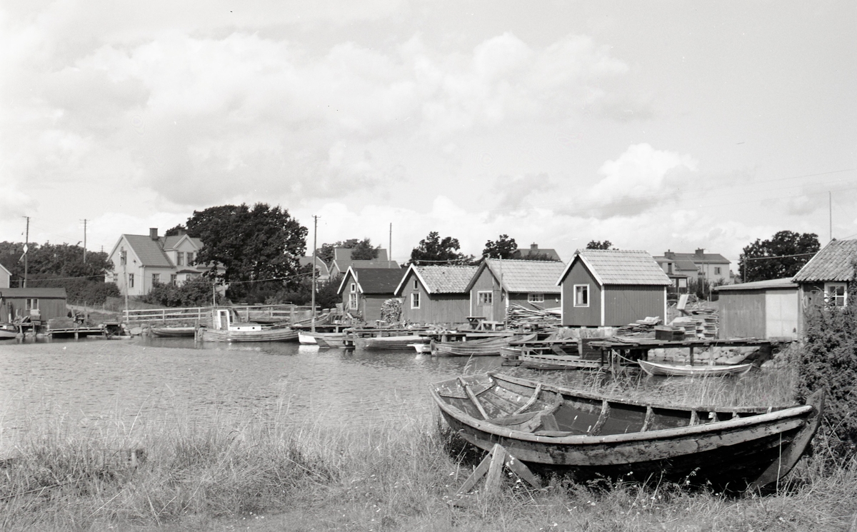 Stensö fiskeläge. Små öppna båtar i hamnen.