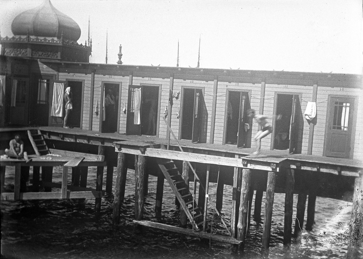 Foto av herravdelningen på kallbadhuset. En naken pojke hoppar just i vattnet. I vänstra hörnet sitter en naken man.