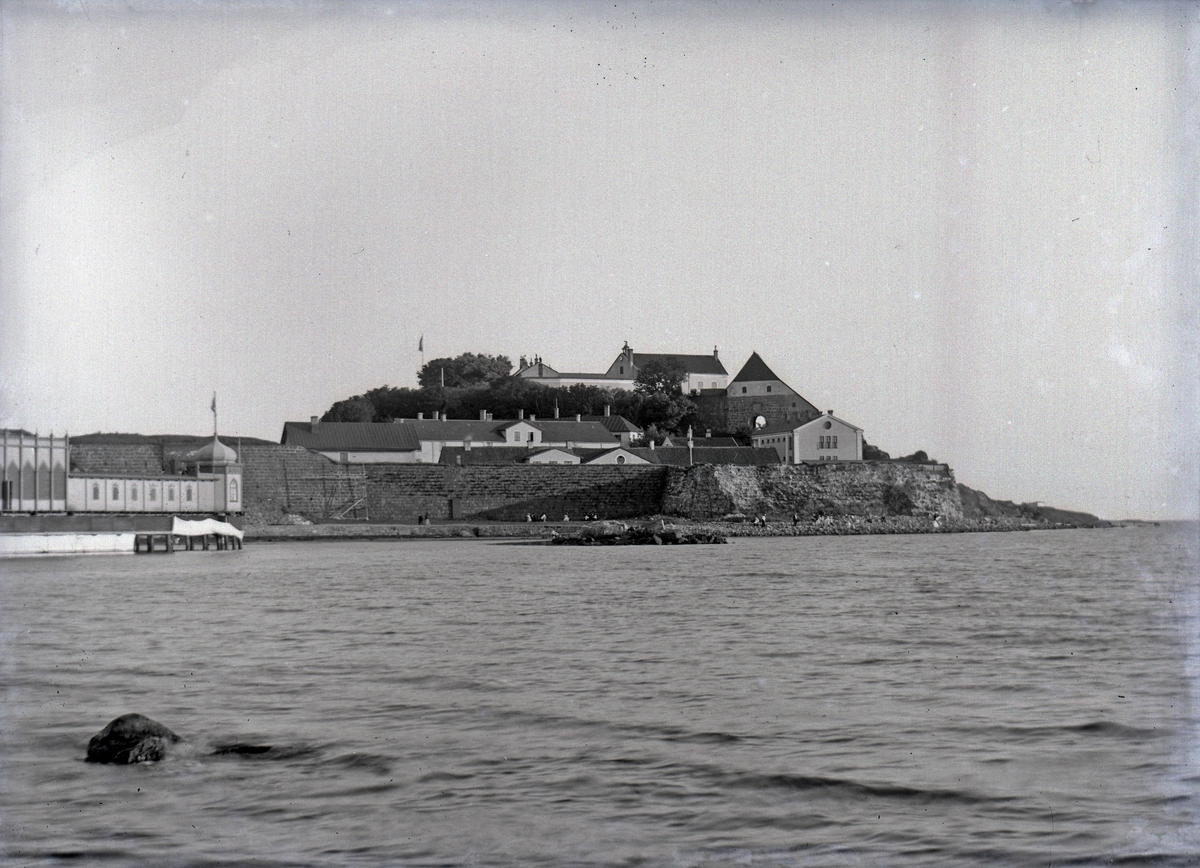 Vy över Varbergs fästning, med kallbadhuset skymtande till vänster.