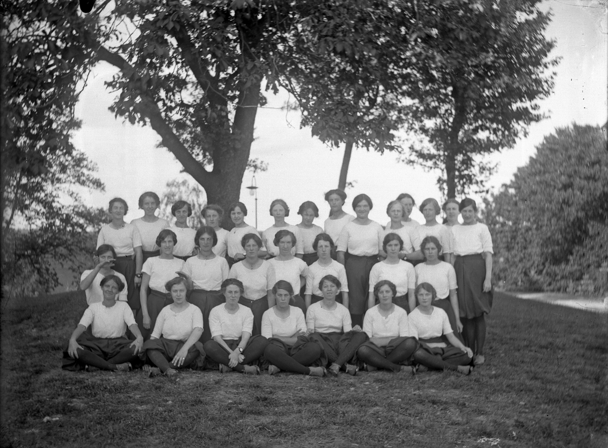 En trupp kvinnliga gymnaster har samlats i parken utanför seminariet, dvs numera Ringsbergsskolan, Växjö.