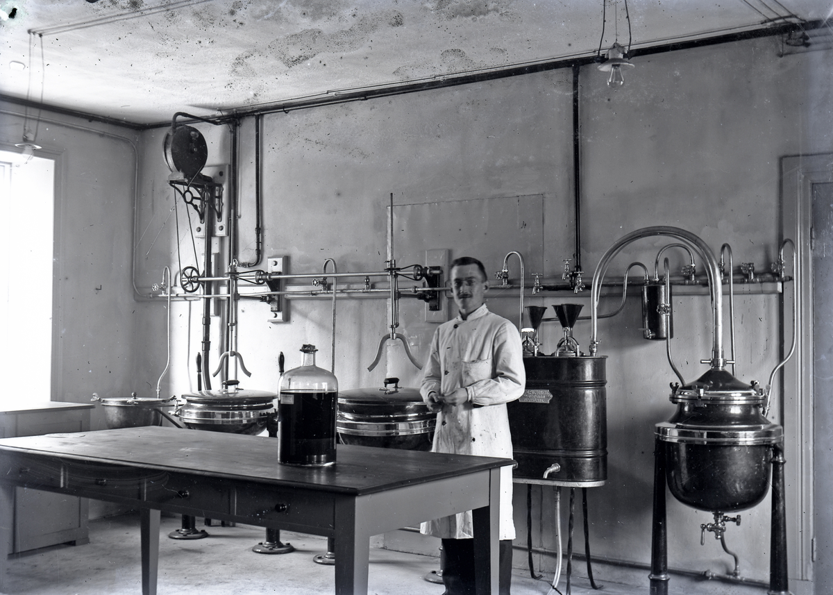 En man i vit rock står bland saker och ting som påminner om ett laboratorium (på apotek eller sjukhus).