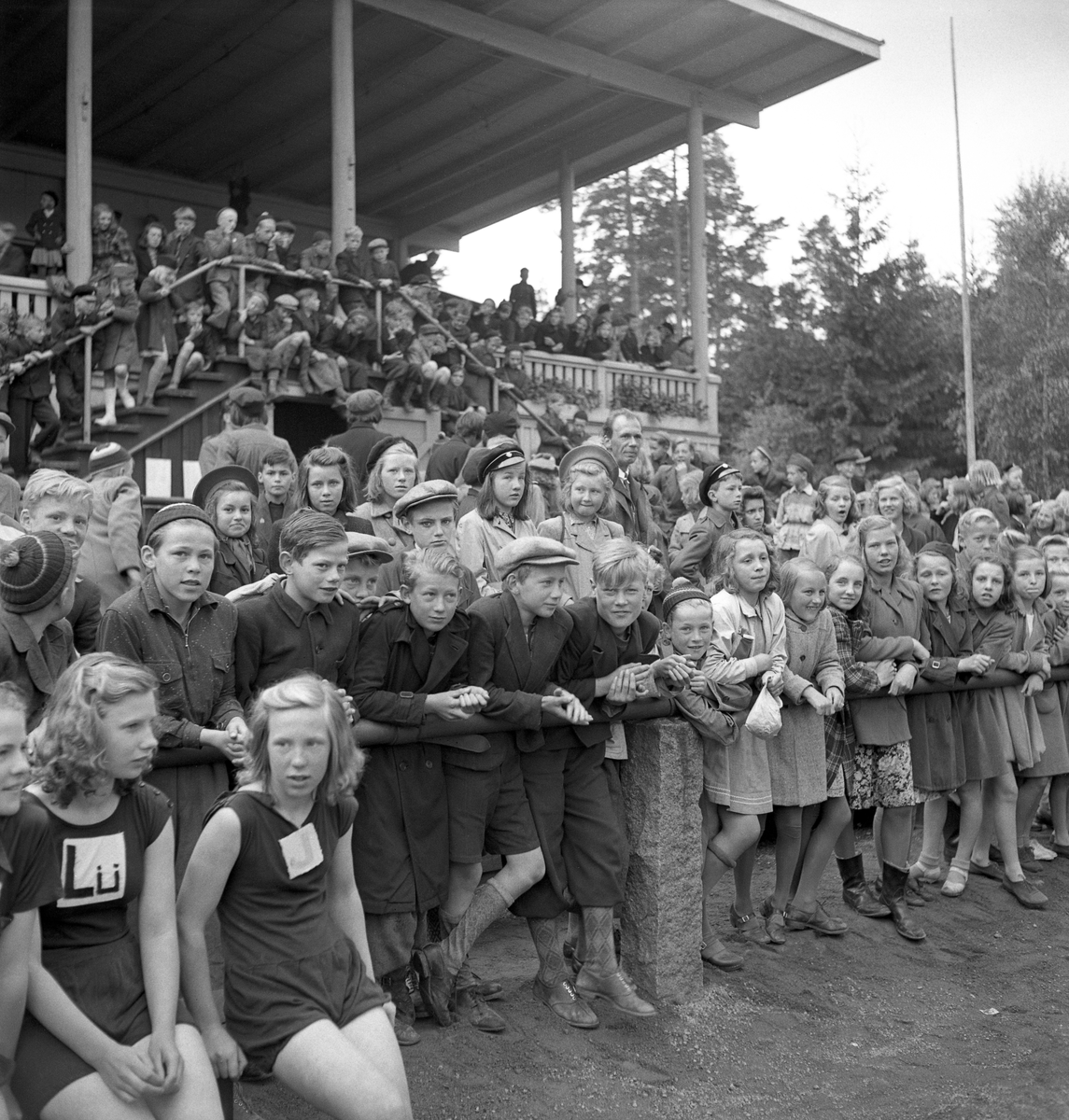 En mängd barn vid räcket nedanför hedersläktaren. Framför dem