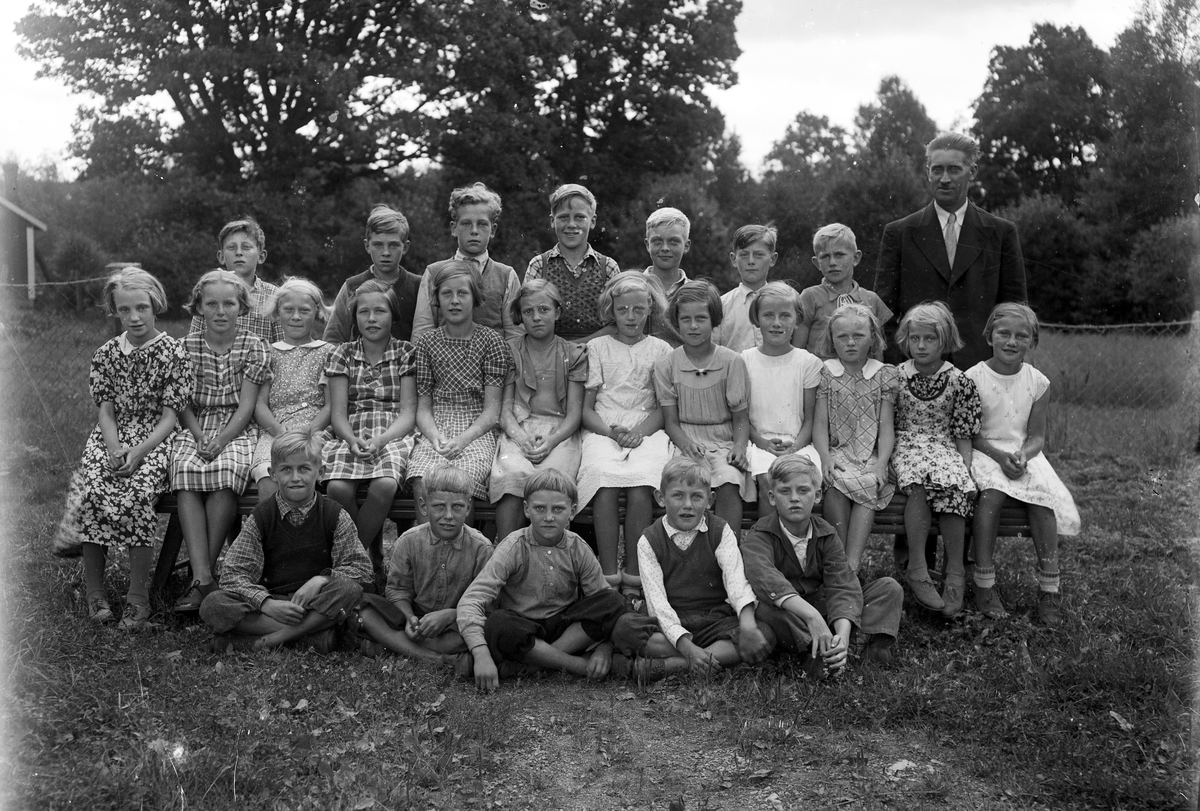 Foto av en skolklass med lärare, som samlats utomhus.