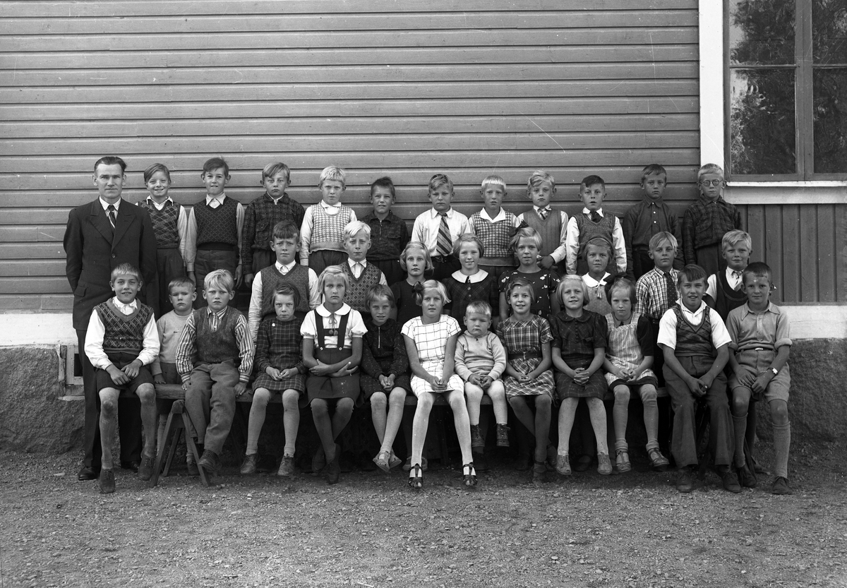 Foto av en skolklass med lärare, som samlats utanför skolan.