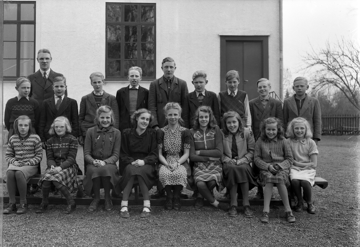 Titel: Foto av en skolklass med lärare, som samlats utanför skolan.