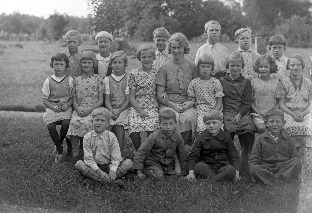 Foto av en skolklass med lärarinna, som samlats utomhus.