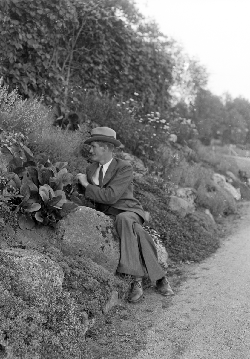 Foto av en man i kostym och hatt som sitter på en sten i en park.