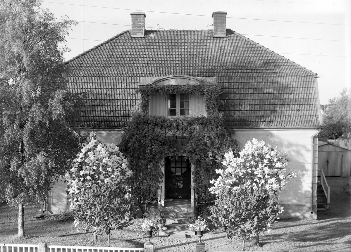 Foto av en reveterad vill med mansardtak, i trädgård.