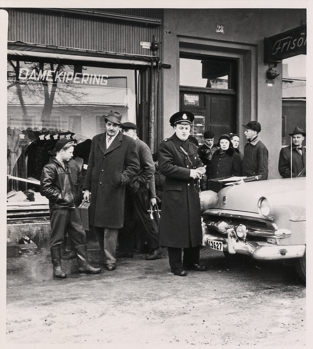Poliskonstapel Ingemar Karlsson synar en bil någonstans i Växjö, 1955.