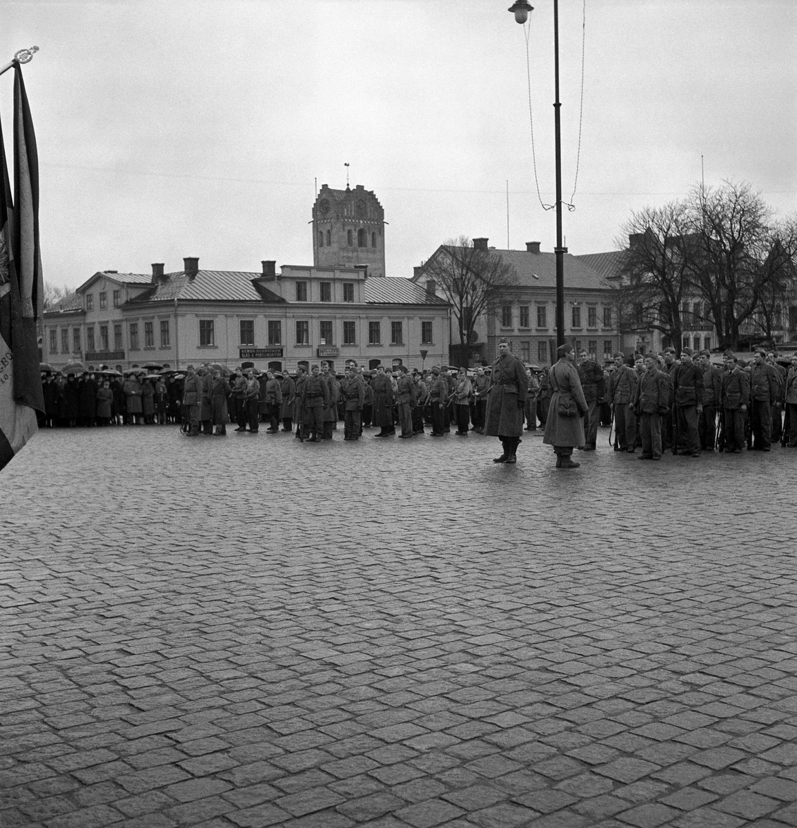 Samling på det regniga Stortorget framför Residenset. I bakgrunden